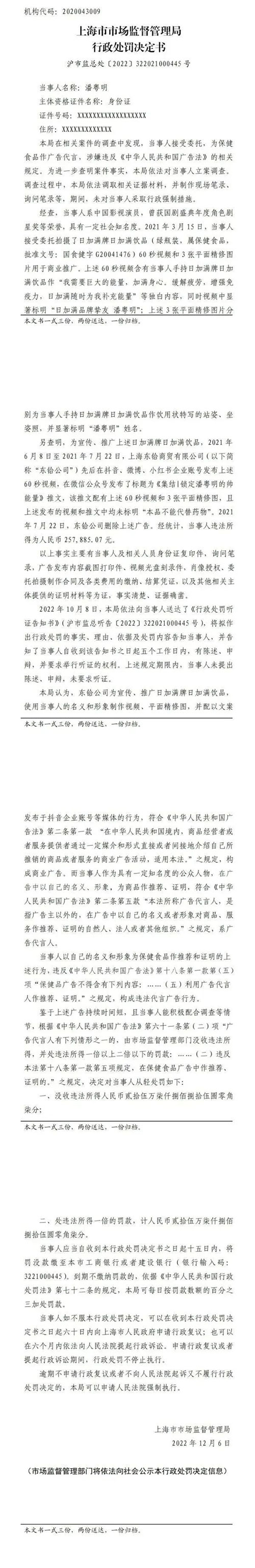 经查,当事人系中国影视演员,曾获国剧盛典年度角色剧星奖等荣誉,具有一定社会知名度。2021年3月15日,当事人接受委托拍摄了日加满牌日加满饮品(绿瓶装,属保健食品, 批准文号:国食健字 G20041476)60秒视频和3张平面精修图片用于商业推广。上述60秒视频含有当事人手持日加满牌日加满饮品作“我需要巨大的能量,加满身心。缓解疲劳,增强免疫力,日加满随时为我补充能量”等独白内容,同时视频中显著标明“日加满品牌挚友 潘粤明”。另查明,为宣传、推广上述日加满牌日加满饮品,2021年6月8日至2021年7月22日,上海东铪商贸有限公司(以下简称“东铪公司”)先后在抖音、微博、小红书企业账号发布上述60秒视频,在微信公众号发布了标题为《集结|锁定潘粤明的帅能量》推文,该推文配有上述60秒视频和3张平面精修图,且上述发布的视频和推文中均未标明“本品不能代替药物”。2021年7月22日,东铪公司删除上述广告。经统计,当事人违法所得为人民币257885.07 元。以上事实主要有当事人及相关人员身份证复印件,询问笔录,广告发布内容截图打印件、视频光盘刻录件,肖像授权、委托拍摄制作合同及各类费用的缴纳、结算凭证,以及其他相关主体提供的证明材料等为证,事实清楚、证据确凿。