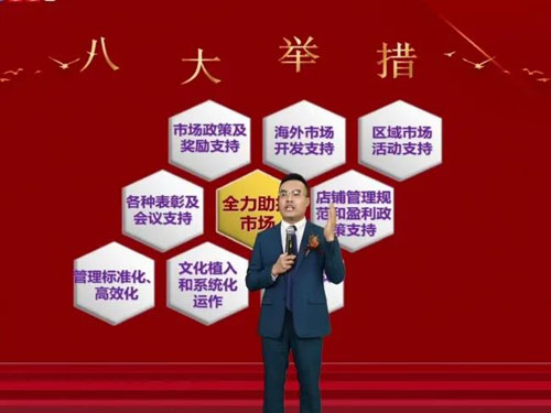 永春堂融商城副总经理徐洪涛做了《2023年度整体市场规划》的主题演讲,2023年融商城将同步推出八大举措——市场政策及奖励支持、海外市场开发规划、区域市场活动支持、公司大型表彰会议、店铺管理规范和盈利政策支持、文化植入和系统化运作、规范管理和服务流程、百人挑战赛,全力助推市场发展。