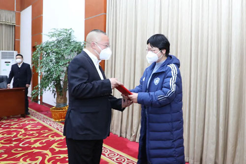 长沙市纪委副书记、市监委副主任朱远红为胡国安董事长发放聘书