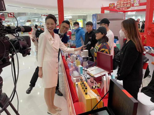 聚合“线下大集+线上带货+宣传推广”多元形式,年货展销现场还设置了带货直播间专区。山东广播电视台主持人王点点和辛凯现场直播带货,向广大网友力荐福瑞达旗下多款好品。直播间氛围热烈,两位主持人全方位介绍产品功效、使用方法,让全国各地的网友都可以突破空间限制,第一时间将“山东好品”带回家,实现新年美丽蜕变。