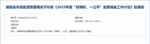 现将《湖南省市场监督管理局2023年度“双随机、一公开”监管抽查工作计划》印发给你们,并提出如下要求,请一并遵照执行。
