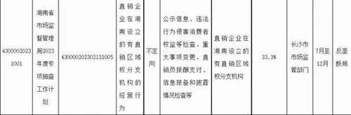 近日,湖南省市场监督管理局印发《2023年度“双随机、一公开”监管抽查工作计划》的通知,其中提到,将对直销企业在湖南设立的有直销区域权分支机构开展抽查工作,抽查事项为“公示信息、违法行为侵害消费者权益等检查、重大事项变更、直销员报酬支付、信息报备和披露情况检查等”。