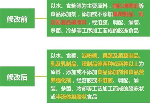 六是放松果冻流体形态的限制。近几年果冻新品是半流体凝胶状,如可吸果冻等,增加“半流体凝胶状食品”,因此修改为“胶冻状或半流体凝胶状食品”。