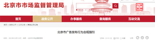 2月22日,北京市市场监管局发布了《北京市广告发布行为合规指引(简称:指引)》。旨在进一步规范北京市广告活动,维护广告市场秩序,促进广告业高质量发展。