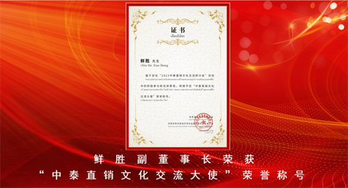 与会嘉宾对和治友德秉承“弘扬养生文化造福人类健康”的梦想,深耕“一带一路”市场,立志将和治友德“打造成世界上最成功的健康养生事业平台”的企业愿景深表赞同。会上,鉴于鲜胜副董事长在“2023中泰直销文化交流研讨会”活动中的积极参与和优异表现,鲜胜副董事长被授予“中泰直销文化交流大使” 荣誉称号。