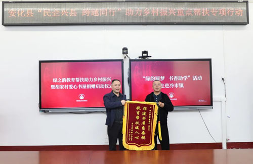 捐赠仪式由安化县人大常委会副主任李艳云主持。活动伊始,中共冷市镇党委书记胡宝成致辞。他首先向绿之韵公益基金会的爱心之举表示衷心的感谢。他表示,文化振兴是乡村振兴的重要推手,教育工作是最大的民生工程,需要更多的爱心企业、爱心人士热心参与。此次捐赠活动,不仅体现了绿之韵心系教育事业、基层文化建设和勇担社会责任的良好形象,更将有力呼吁各级组织、广大党员干部,在建设美丽乡村、致力乡村振兴中更好发挥引领带动作用,引导青少年们弘扬中华民族的优秀文化,丰富自身技能,为乡村振兴作出更大的贡献。随后,胡均安副总裁代表绿之韵捐赠100万元爱心支票,中共冷市镇党委书记胡宝成、胡家村村支部书记胡利民向绿之韵集团回赠爱心牌匾。与会领导现场共同为爱心书屋揭牌并为优秀学生代表现场发放奖学金。