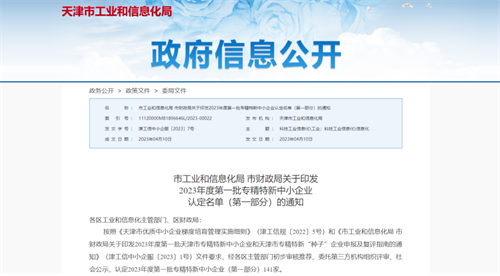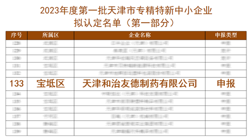 2023年4月10日,天津市工业和信息化局、市财政局公布《关于印发2023年度第一批专精特新中小企业认定名单(第一部分)的通知》,天津和治友德制药有限公司被成功认定为天津市专精特新中小企业。