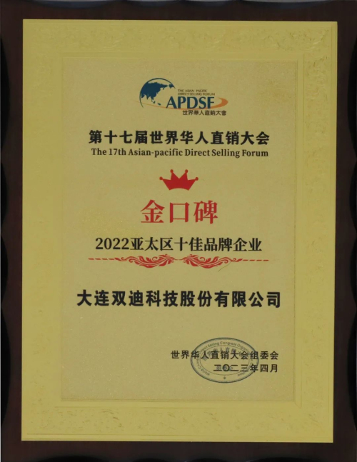 双迪公司荣获“2022亚太区十佳品牌企业—金口碑奖”