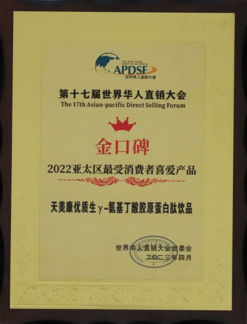 天美康优质生®γ-氨基丁酸胶原蛋白肽饮品荣获“2022亚太区最受消费者喜爱产品奖”