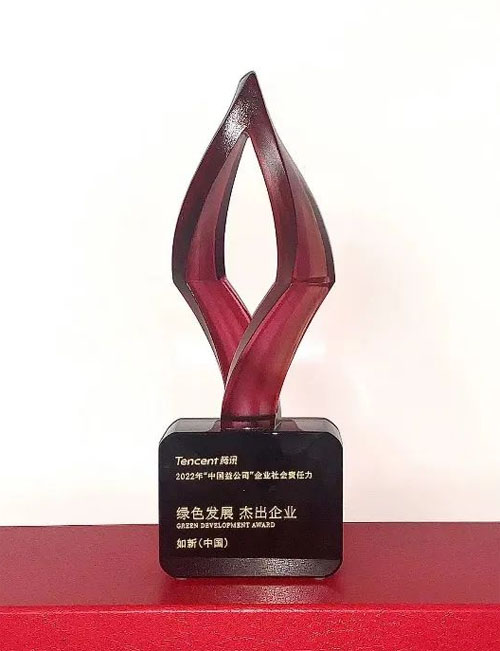 日前,如新中国参加了2022腾讯新闻责任力年度论坛,并荣获2022 “中国益公司”企业社会责任评选的“绿色发展杰出企业”奖项。这一奖项是对如新在绿色可持续发展领域长期践行的认可,也为如新未来继续推进绿色可持续发展增强了信心。