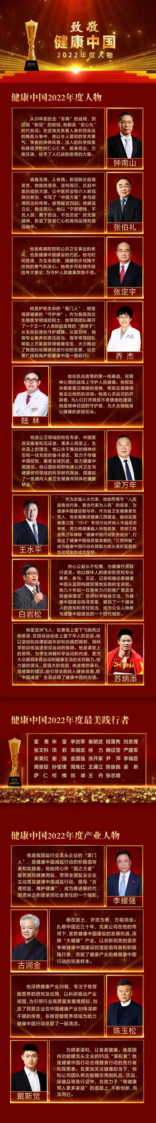 据悉,“致敬健康中国2022年度人物盛典”是“健康中国”上升为国家战略后首次以公益宣传形式举办的年度人物致敬盛典。旨在深入贯彻落实《“健康中国2030”规划纲要》《健康中国行动(2019—2030年)》等文件精神,大力宣传健康中国领域先进人物和先进典型,深入培育和践行社会主义核心价值观,营造学习宣传贯彻党的二十大精神的浓厚氛围,期冀以榜样的力量,把健康中国行动推向深入,在新时代奋力谱写健康中国建设新篇章!