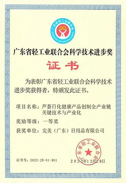 2022年年底,完美公司《芦荟日化健康产品创制全产业链关键技术与产业化》项目获广东省轻工业联合会科学技术进步奖一等奖的殊荣。本次芦荟产业产学研合作项目由完美公司牵头,联合中山大学、云南万绿生物开展,围绕芦荟原料质量控制与高效种植、核心配料稳态增效制备与健康效应评价、多元化健康产品设计创制与产业化开展系列创新研究。