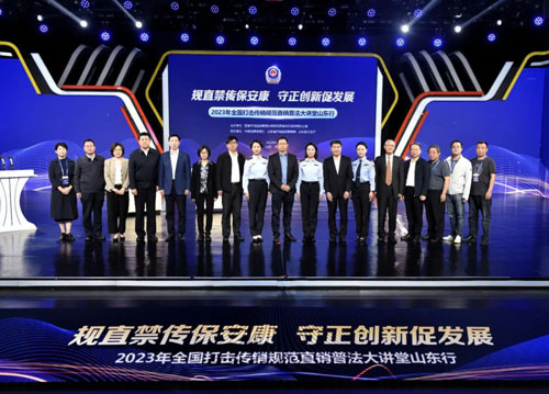 2023年5月9日,全国打击传销规范直销普法大讲堂山东行活动在济南市举办。活动由市场监管总局规范直销与打击传销办公室主办,山东省市场监管局、山东省公安厅、中国消费者报社承办,主题为“规直禁传保安康,守正创新促发展”。市场监管总局价监竞争局、公安部经侦局有关负责同志参加。绿之韵集团参加本次会议,并组织员工、经销商、直销员在线实时收看了本期大讲堂活动直播。