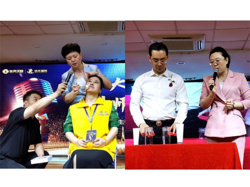 培训讲师张铧洢、李德巍带来部分刚需快消产品的现场演示,借助水、火、蓝墨水等工具,用事实说话,用效果验证,让学员眼见为实,现场见证了炎帝产品的优越性。