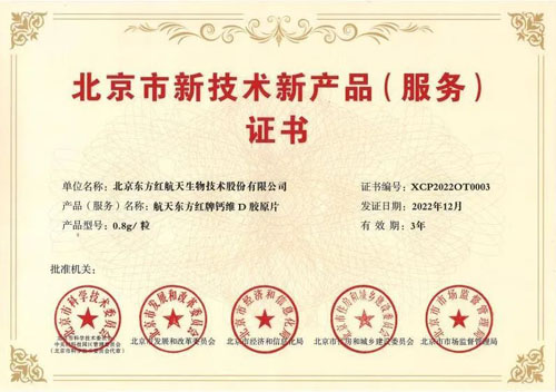 北京市新技术新产品(服务)证书的颁发,不仅是对航天东方红牌钙维D胶原片(原航力片)在专利配方等方面的认可,也是对产品稳定向、先进性、创新性的认可,符合本市重点发展的战略性新兴产品的要求。同时,东方红公司也将进一步加大科研创新力度,继续为客户提供更好的产品和更优质的服务。