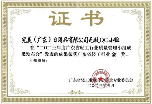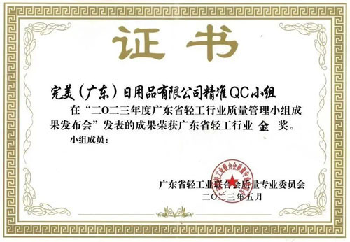 其中,扬州完美日用品有限公司呼啦圈,完美(广东)日用品有限公司节能圈、无敌QC小组、精准QC小组发表的成果荣获2023年度“广东省轻工行业金奖”;完美(广东)日用品有限公司降本圈,扬州完美日用品有限公司共好圈、降耗圈发表的成果荣获2023年度“广东省轻工行业银奖”。