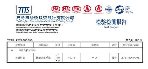 根据权威检测,夏凉被接触凉感系数已经达到了0.26 J/(㎡.s),具有接触瞬间凉感性能,比国家相关标准的要求还高(国家标准冷感值≥0.15QMAX)。