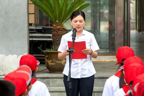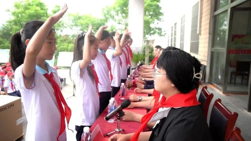 在高高飘扬的国旗下,少先队员们为领导、嘉宾敬献红领巾。