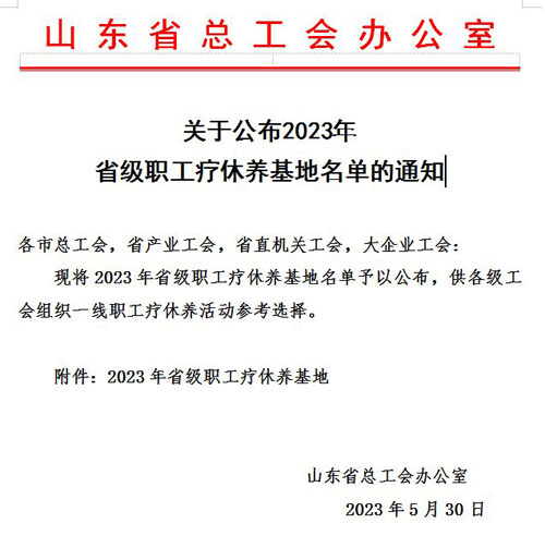 5月30日,山东省总工会发文,公布了2023年省级职工疗休养基地名单,位于临沂平邑的蒙山康谷温泉酒店榜上有名,成为山东省级职工疗休养基地。