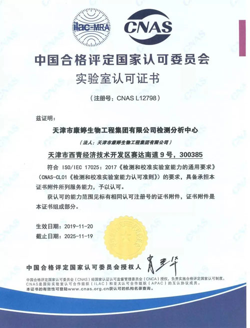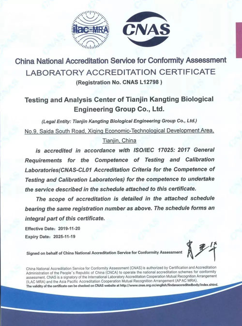 康婷集团于2019年11月通过中国合格评定国家认可委员会(CNAS)认可,证书编号:CNAS L12798。