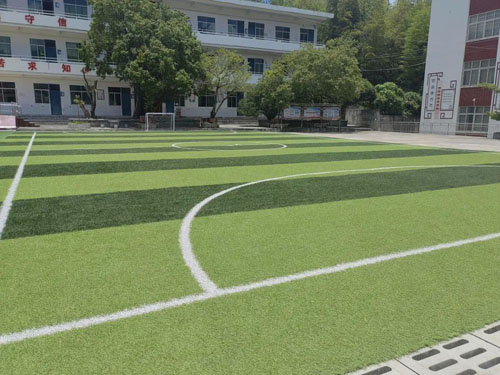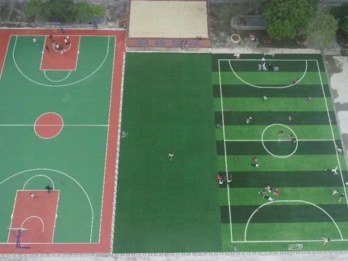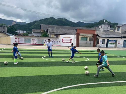 △左上图:由于经济条件的限制,捐赠之前的大吉山小学运动场所一直是坚硬的水泥地——孩子们在上面跑步、跳跃、踢足球,每一次落地对他们稚嫩的肌肉和关节都是不小的挑战,每一次摔倒都伴随着强烈的疼痛。经过改建施工之后,孩子们拥有了一个专业、安全的足球场,见右下图。