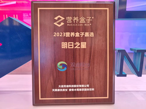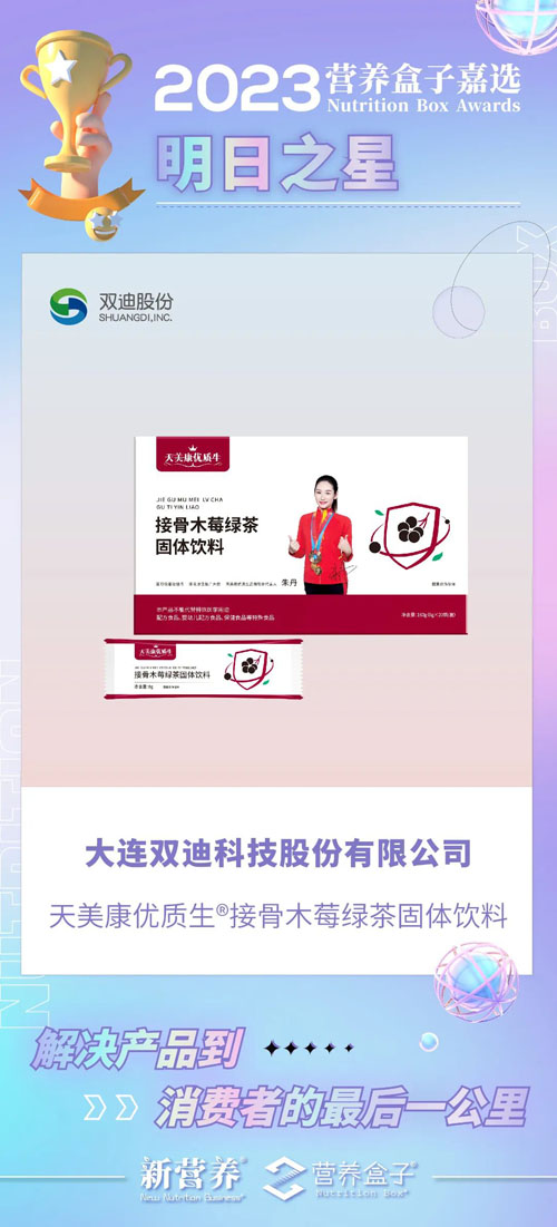 6月7日,“2023第11届新营养大会暨「营养盒子」颁奖盛典”隆重举行,双迪旗下产品:天美康优质生®接骨木莓绿茶固体饮料喜获新营养“明日之星”奖项。