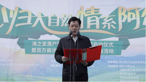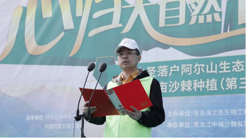 阿尔山森工公司党委书记、董事长张晓超在活动现场致开场词,对活动的成功举办表示祝贺,并就海之圣落户阿尔山生态工程做出了高度评价。他表示,阿尔山森工公司认真践行生态文明,坚持走“生态优先、绿色发展”之路,现已栽植沙棘经济林总面积达6.5万亩,相信通过海之圣公司与中福沙棘公司的强强合作,融合社会各界的力量,将打造多元化沙棘产业新业态,让绿色产业在阿尔山更加茁壮成长。