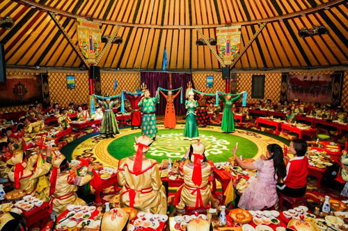 当草原美食邂逅丰富多菜的蒙餐文化——宫廷御宴“诈马宴”,品尝草原特色美食佳肴,载歌载舞中尽情把酒言欢,创业合伙人们全感官体验着蒙族文化。