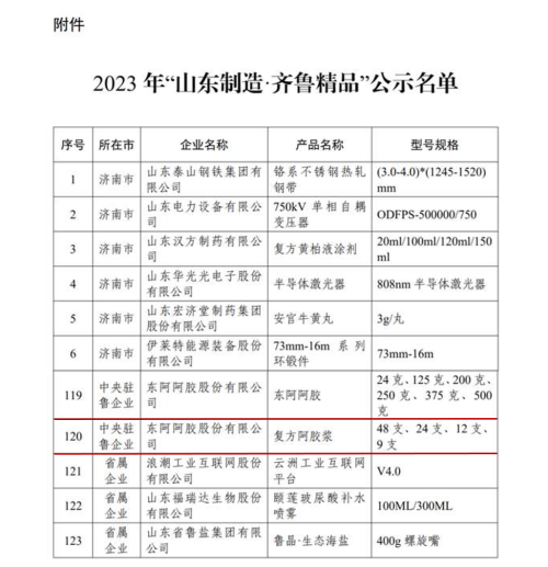 近日,山东省工信厅公示了2023年“山东制造·齐鲁精品”名单,全省共有123项产品入选。其中,公司东阿阿胶和复方阿胶浆两项产品成功入选,也是全省唯一入围两项产品的企业!