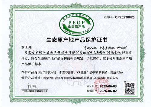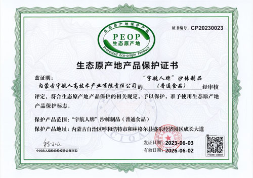 近日,内蒙古宇航人集团全系列沙棘产品荣获生态原产地产品保护证书。原产地保护基地包括:黑老夭4500公顷、蛮汉山3978公顷、羊群沟4680公顷、南天门4480公顷、清水河1335公顷共计18973公顷(284595亩)。