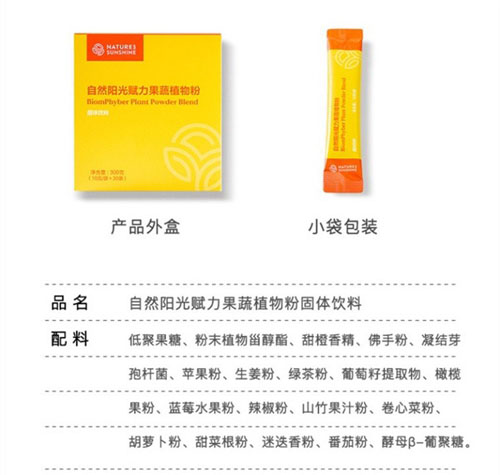 自然阳光旗下的赋力果蔬植物粉富含低聚果糖、蔬果粉、凝结芽孢杆菌等营养物质。其中低聚果糖有助于肠道状态有效恢复并维持肠道微生态平衡,同时利于提高肠道对食物的消化;凝聚芽孢杆菌则能辅佐肠道状态有效规复并维持肠道微生态均衡,帮助增加胃肠道等器官对有害微生物的自护力,帮助促进肠道对食物的消化。另一方面,自然阳光赋力果蔬植物粉富含佛手粉、生姜粉、绿茶粉等蔬果营养,以及苹果纤维、菊粉等丰富的膳食纤维及各种维生素和微量元素,能够通过帮助刺激消化道,调节肠道蠕动,为身体补充充足营养,让身体更具活力。