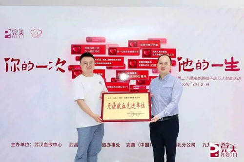 活动现场,完美湖北分公司被授予“无偿献血先进单位”荣誉称号,标志着完美公司以坚定信念和热情推动无偿献血事业普及与推广的举措得到了肯定。自举办“你的一次 他的一生”完美百城千店万人献血活动以来,完美公司用实际行动凝聚起社会的共识和支持,为无数人带去生命的希望,为促进构建充满爱和希望的和谐社会尽一份力。截至中午12时,累计成功献血68人,献血总量达 17300毫升。