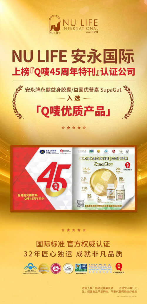 自1991年成立以来,安永NU LIFE一直致力于推广健康与财富。历经32年的发展,帮助万千企业家重拾健康并实现梦想。在这个值得庆祝的时刻,安永NU LIFE特别引以为傲的产品——安永牌永健益身胶囊(海外版:益菌优营素SupaGut),连续两年荣获「Q唛优质产品」认证(牌照号码:C868-ZH)。这是对其产品质量和有效性的最高认可。