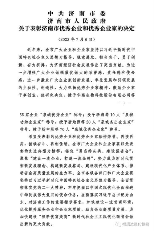 近日,济南市委、市政府下发了《关于表彰济南市优秀企业和优秀企业家的决定》,福瑞达党委书记、董事长贾庆文荣获“泉城杰出企业家”荣誉称号。