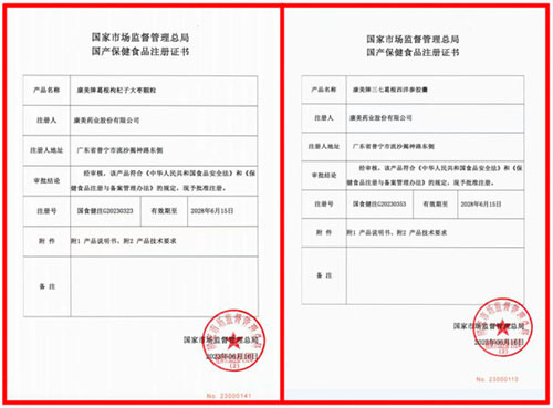 近日,康美牌葛根枸杞子大枣颗粒(国食健注G20230323)、康美牌三七葛根西洋参胶囊(国食健注G20230353)2款产品完成国产保健食品注册工作,获得国家市场监督管理总局国产保健食品注册证书。截止目前,康美药业已获得注册制保健食品批准证书共14件。