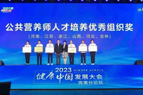 作为从事大健康科技产业的企业,完美公司于2019年被中国保健协会授予“健康管理顾问培训基地”,2022年被中国营养保健食品协会授予“公共营养师职业技能等级培训考核基地”。截至目前,已为社会输送健康管理人才逾4万人,各地的公共营养师考培工作取得了可喜的成绩。为了表彰各地分公司在培养公共营养师人才工作中作出的贡献,2023健康中国发展大会完美分论坛特别举行了“公共营养师人才培养优秀组织奖”颁奖仪式,由中国营养保健食品协会会长边振甲、完美公司高级副总裁岳新鸿为完美河南、江苏、浙江、山西、河北、吉林分公司颁发荣誉。