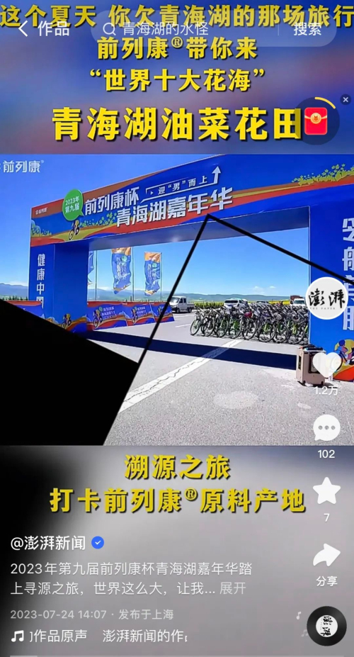 此次骑行活动选在美丽的青海湖畔——门源。这里拥有世界最高海拔的赛道和沿途美丽的风光,前列康门源油菜花种植基地就坐落在这片纯净的高原之上。3300米海拔,年均2500小时日照,以及20℃的昼夜温差,让这里的油菜花粉营养成分更丰富,含量更高。而每片前列康所需原料,需要蜜蜂采集3万朵花,飞行约5000公里。现场还同时举办了“摄影比赛”和 “打卡集卡”竞赛,一幅幅美丽的青海照片,一张张精美的“集卡卡图”,让大家在记录美景体验活动趣味的同时,更感受到青海门源的优美与壮阔。南方周末对此次活动进行了首页报道,澎湃视频、抖音视频、快手视频同步发布。