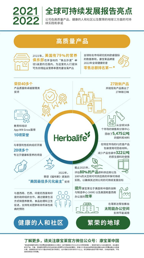 康宝莱2021-2022年全球可持续发展报告聚焦了公司在如下三个领域取得的成就: