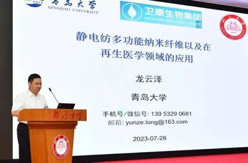 青岛大学龙云泽院士作《静电纺多功能纳米纤维以及在再生医学领域的应用》学术报告,汇报了壳聚糖等多糖纤维溶液制备成多功能纳米纤维并应用于再生医领域的科研成果。