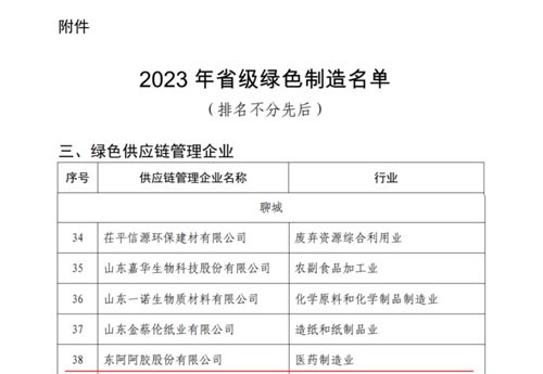 近日,山东省工业和信息化厅发布《关于公布2023年(第一批)省级绿色制造名单的通知》,该名单分为“绿色工厂”、“绿色工业园区”、“绿色供应链管理企业”三部分,其中,东阿阿胶股份有限公司(以下简称“东阿阿胶”)入选“绿色供应链管理企业”名单。