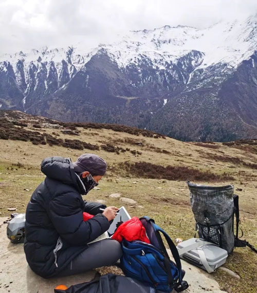 在四姑娘山下的一片开阔地上,訾新生席地而坐,一手拿着触控笔,在一个贴满“暖宝宝”的笔记本电脑上答题——参加公共营养师考试。这是訾新生的朋友拍下的一张照片。