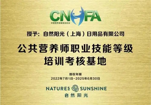 中国营养保健食品协会授予自然阳光“公共营养师职业技能等级培训考核基地”铜牌