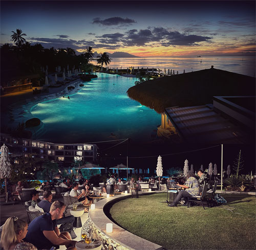 傍晚,伙伴们离开茉莉雅搭乘客轮再次回到主岛,入住Hilton酒店,晚上在泳池边的酒廊欣赏夕阳,点上一杯鸡尾酒,倾听波利尼西亚歌手献上的歌谣,享受星空美景下的南太平洋之夜。