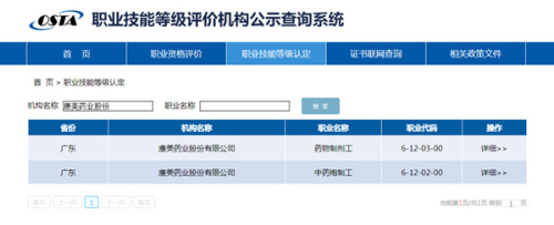 近日,经揭阳市人力资源和社会保障局职业技能服务指导中心评估并通过备案、国家职业技能等级评价机构公示查询系统(OSTA)公示,康美药业顺利获得揭阳市职业技能等级认定资质,可以对内部员工开展职业技能等级认定工作。