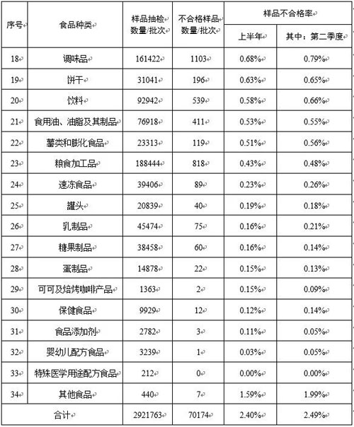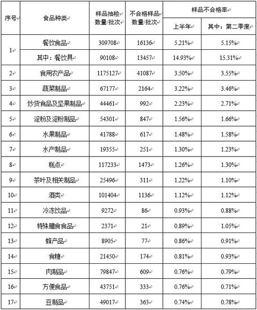 从抽样食品品种来看,消费量大的粮食加工品,食用油、油脂及其制品,肉制品,蛋制品,乳制品等5大类食品,监督抽检不合格率分别为0.43%、0.53%、0.76%、0.15%、0.16%,均低于总体抽检不合格率。与上年同期相比,餐饮食品、酒类等25大类食品抽检不合格率有所降低,但特殊膳食食品、茶叶及相关制品、蔬菜制品等8类食品抽检不合格率有所上升。保健食品上半年不合格率达到0.12%,其中,第二季度达到0.14%。