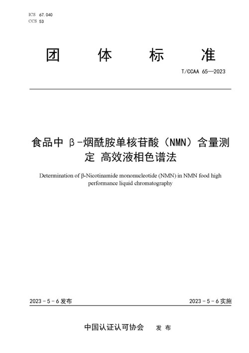 2023年,由中国标准化研究院、金达威、汤臣倍健和庶正康讯等11家单位研究并提出的《食品中β-烟酰胺单核苷酸(NMN)含量测定 高效液相色谱法》团体标准项目由中国认证认可协会正式发布。此外,《化妆品中β-烟酰胺单核苷酸(NMN)含量测定 高效液相色谱法》业已在中国检验检测学会立项(项目编号为2022LX-CITS009)。