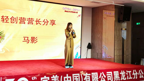 黑龙江省轻创营营长马影经理作为轻创营代表发言,她感谢公司对完美年轻创业者的全力支持,更表示完美30正当年,年轻一代的完美创业者要用行动回馈公司,用行动谱写不悔的完美人生。