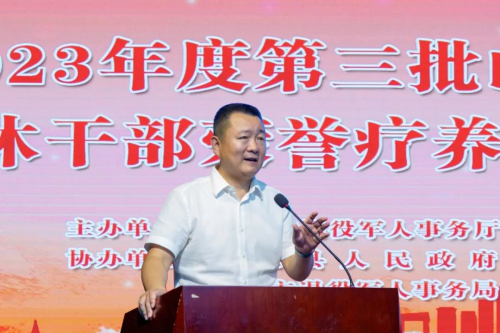 集团董事长王宗继在致辞中,对军休功臣的到来表示热烈欢迎并致以崇高敬意。董事长介绍了蒙山养生“三宝”,即高地磁、小分子团水、高负氧离子成就了蒙山优渥的养生环境;介绍了基地生物电疗、吸氢等高科技疗养。