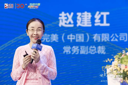 完美公司常务副总裁赵建红以《聚焦健康之美 助力健康中国》为题发表演讲。健康美丽产业承担着前所未有的重要角色,而致力成为全人类健康、美丽服务的卓越提供者是完美公司一直以来的愿景。她从“开创健康之美”、“共建健康之美”、“传播健康之美”三个维度分享了完美公司在健康之美的道路上所做的一系列努力与成果。