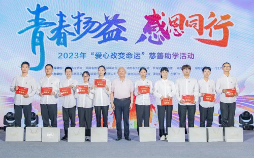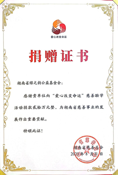 涓涓爱心汇流成河,点点星光照亮未来。爱心企业、爱心单位线上线下齐发力。今年7月,绿之韵公益基金会携手湖南省慈善总会、芒果公益开启“爱心改变命运”助学季,上线“2023爱心改变命运”网络筹款募捐项目,向社会筹措助学资金,资助湖南省内励志学子圆梦大学。此次活动现场,劳嘉理事长代表绿之韵公益基金会向“爱心改变命运”项目捐资20万,为圆励志学子大学梦贡献一份力量。